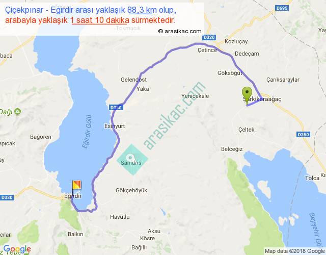 Çiçekpınar - Eğirdir arası yaklaşık olarak 90 km/h ile yukarıda belirtilen sürede olup, iki yerin kuş uçuşu uzaklığı (mesafesi) 46'dir. Yolculuk otobüsle 1 saat 31 dakika sürmektedir.