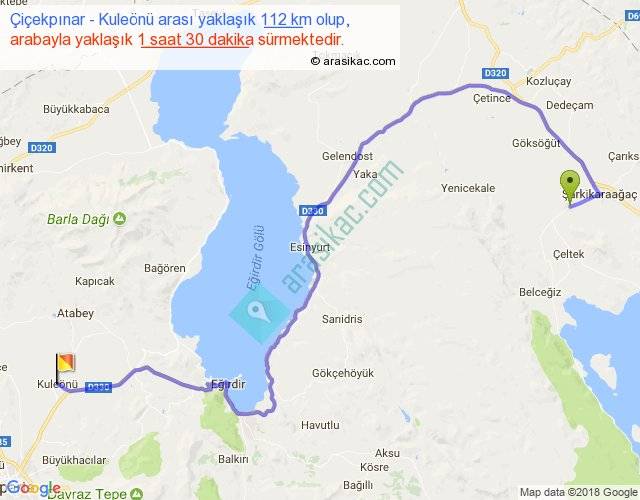 Çiçekpınar - Kuleönü arası yaklaşık olarak 90 km/h ile yukarıda belirtilen sürede olup, iki yerin kuş uçuşu uzaklığı (mesafesi) 65'dir. Yolculuk otobüsle 1 saat 57 dakika sürmektedir.