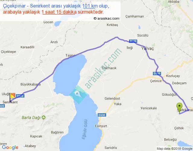 Çiçekpınar - Senirkent arası yaklaşık olarak 90 km/h ile yukarıda belirtilen sürede olup, iki yerin kuş uçuşu uzaklığı (mesafesi) 67'dir. Yolculuk otobüsle 1 saat 37 dakika sürmektedir.