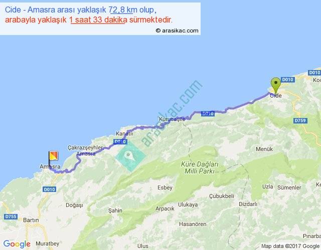 Cide - Amasra arası yaklaşık olarak 90 km/h ile yukarıda belirtilen sürede olup, iki yerin kuş uçuşu uzaklığı (mesafesi) 53'dir. Yolculuk otobüsle 2 saat 0 dakika sürmektedir.