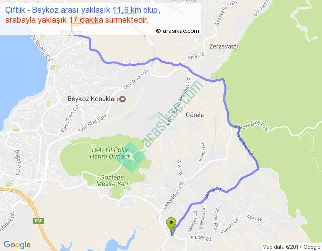 Çiftlik - Beykoz arası yaklaşık olarak 90 km/h ile yukarıda belirtilen sürede olup, iki yerin kuş uçuşu uzaklığı (mesafesi) 6'dir. Yolculuk otobüsle 22 dakika sürmektedir.
