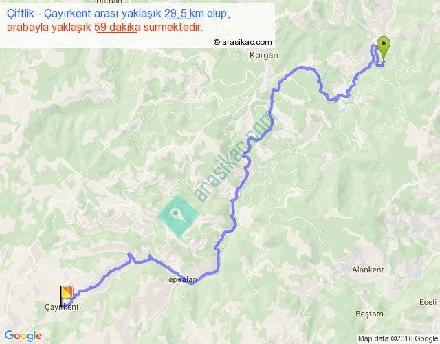 Çiftlik - Çayırkent arası yaklaşık olarak 90 km/h ile yukarıda belirtilen sürede olup, iki yerin kuş uçuşu uzaklığı (mesafesi) 17'dir. Yolculuk otobüsle 1 saat 16 dakika sürmektedir.