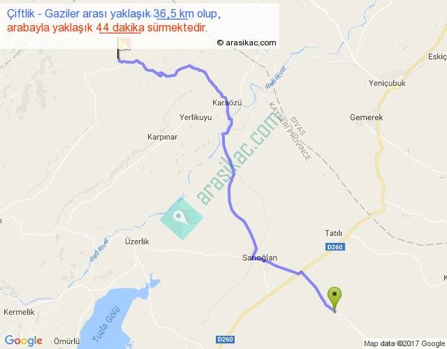 Çiftlik - Gaziler arası yaklaşık olarak 90 km/h ile yukarıda belirtilen sürede olup, iki yerin kuş uçuşu uzaklığı (mesafesi) 28'dir. Yolculuk otobüsle 57 dakika sürmektedir.