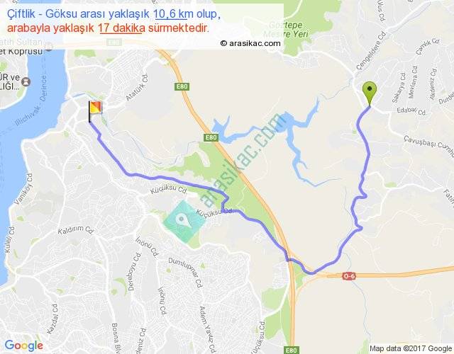 Çiftlik - Göksu arası yaklaşık olarak 90 km/h ile yukarıda belirtilen sürede olup, iki yerin kuş uçuşu uzaklığı (mesafesi) 6'dir. Yolculuk otobüsle 22 dakika sürmektedir.