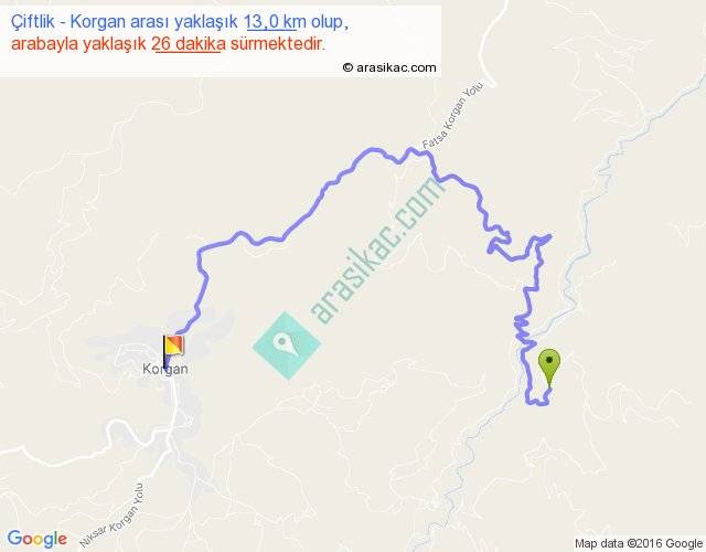 Çiftlik - Korgan arası yaklaşık olarak 90 km/h ile yukarıda belirtilen sürede olup, iki yerin kuş uçuşu uzaklığı (mesafesi) 5'dir. Yolculuk otobüsle 33 dakika sürmektedir.