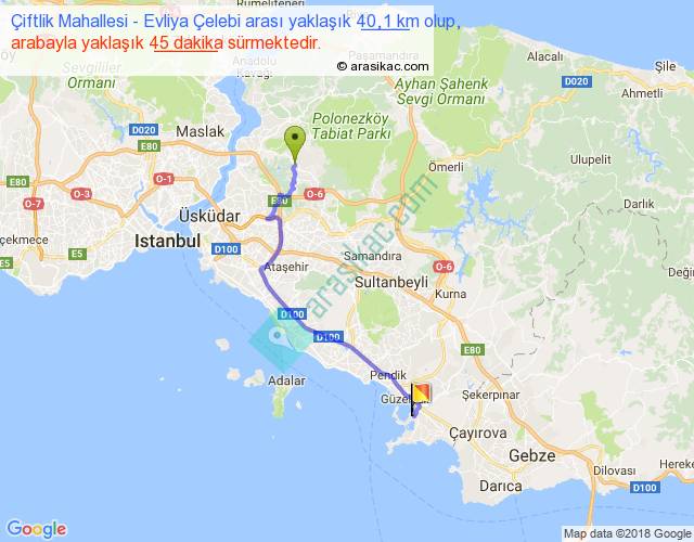 Çiftlik Mahallesi - Evliya Çelebi arası yaklaşık olarak 90 km/h ile yukarıda belirtilen sürede olup, iki yerin kuş uçuşu uzaklığı (mesafesi) 29'dir. Yolculuk otobüsle 58 dakika sürmektedir.