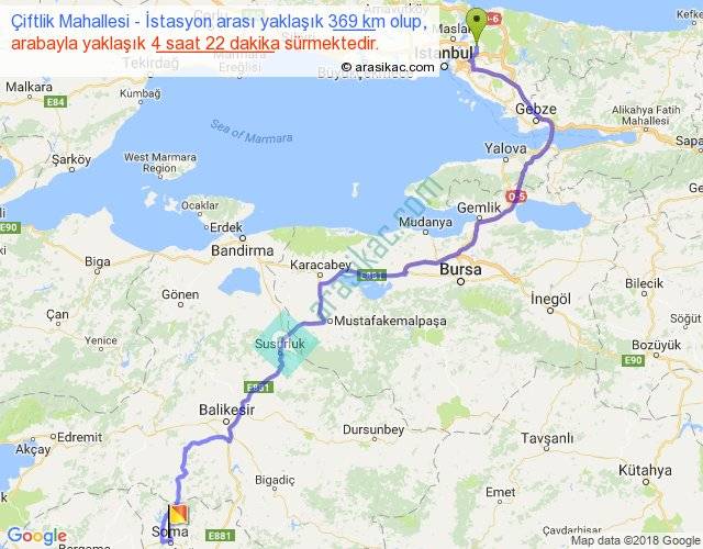 Çiftlik Mahallesi - İstasyon arası yaklaşık olarak 90 km/h ile yukarıda belirtilen sürede olup, iki yerin kuş uçuşu uzaklığı (mesafesi) 245'dir. Yolculuk otobüsle 5 saat 40 dakika sürmektedir.
