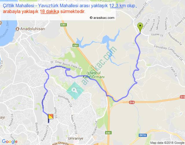 Çiftlik Mahallesi - Yavuztürk Mahallesi arası yaklaşık olarak 90 km/h ile yukarıda belirtilen sürede olup, iki yerin kuş uçuşu uzaklığı (mesafesi) 6'dir. Yolculuk otobüsle 23 dakika sürmektedir.