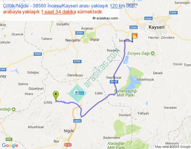 Çiftlik Niğde - 38560 İncesu Kayseri arası yaklaşık olarak 90 km/h ile yukarıda belirtilen sürede olup, iki yerin kuş uçuşu uzaklığı (mesafesi) 78'dir. Yolculuk otobüsle 2 saat 2 dakika sürmektedir.