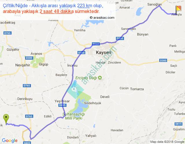 Çiftlik Niğde - Akkışla arası yaklaşık olarak 90 km/h ile yukarıda belirtilen sürede olup, iki yerin kuş uçuşu uzaklığı (mesafesi) 167'dir. Yolculuk otobüsle 3 saat 38 dakika sürmektedir.