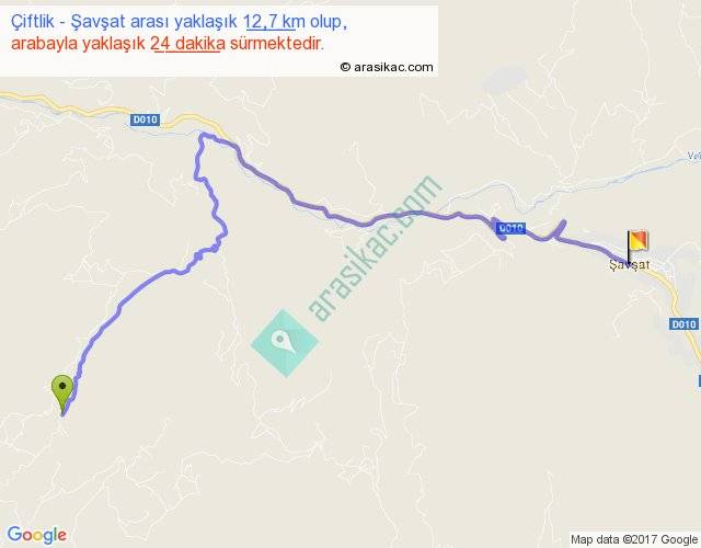 Çiftlik - Şavşat arası yaklaşık olarak 90 km/h ile yukarıda belirtilen sürede olup, iki yerin kuş uçuşu uzaklığı (mesafesi) 8'dir. Yolculuk otobüsle 31 dakika sürmektedir.