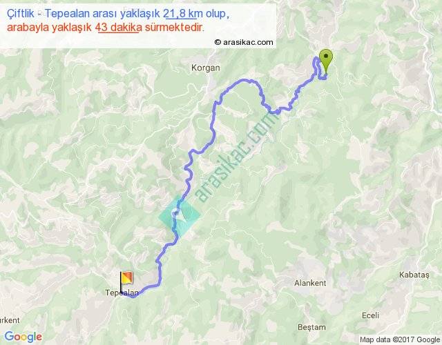 Çiftlik - Tepealan arası yaklaşık olarak 90 km/h ile yukarıda belirtilen sürede olup, iki yerin kuş uçuşu uzaklığı (mesafesi) 12'dir. Yolculuk otobüsle 55 dakika sürmektedir.