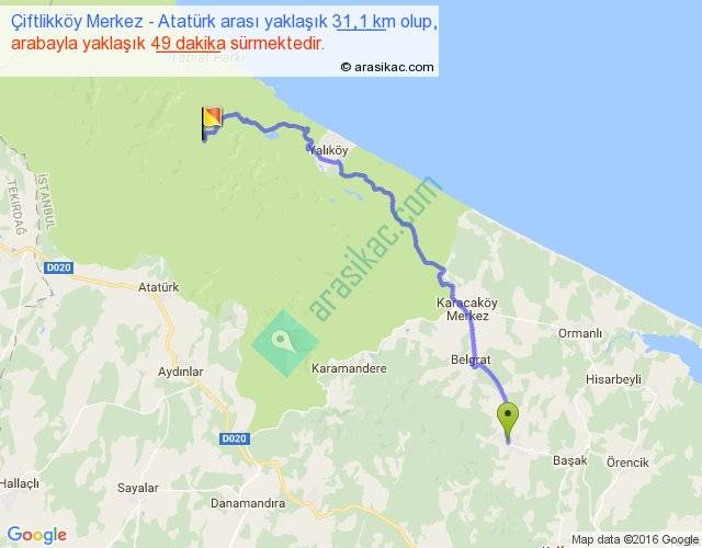Çiftlikköy Merkez - Atatürk arası yaklaşık olarak 90 km/h ile yukarıda belirtilen sürede olup, iki yerin kuş uçuşu uzaklığı (mesafesi) 22'dir. Yolculuk otobüsle 1 saat 3 dakika sürmektedir.