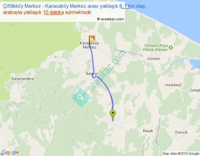 Çiftlikköy Merkez - Karacaköy Merkez arası yaklaşık olarak 90 km/h ile yukarıda belirtilen sürede olup, iki yerin kuş uçuşu uzaklığı (mesafesi) 7'dir. Yolculuk otobüsle 13 dakika sürmektedir.