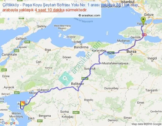 Çiftlikköy - Paşa Koyu Şeytan Sofrası Yolu No: 1 arası yaklaşık olarak 90 km/h ile yukarıda belirtilen sürede olup, iki yerin kuş uçuşu uzaklığı (mesafesi) 272'dir. Eğer belirtilen yerler arasında uçak seferi var ise bu süre uçakla 25 dakika'ya kadar düşebilir. Yolculuk otobüsle 5 saat 25 dakika sürmektedir.
