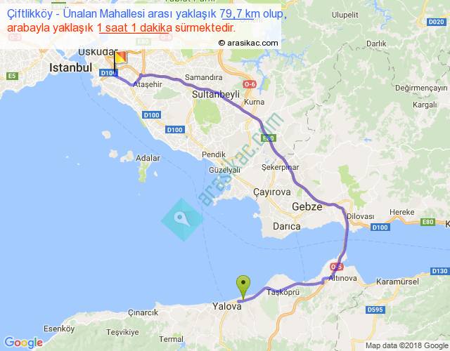 Çiftlikköy - Ünalan Mahallesi arası yaklaşık olarak 90 km/h ile yukarıda belirtilen sürede olup, iki yerin kuş uçuşu uzaklığı (mesafesi) 43'dir. Yolculuk otobüsle 1 saat 19 dakika sürmektedir.