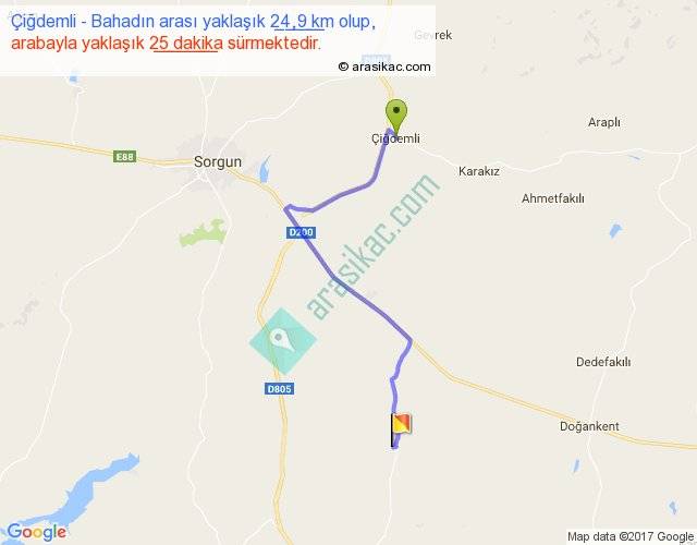 Çiğdemli - Bahadın arası yaklaşık olarak 90 km/h ile yukarıda belirtilen sürede olup, iki yerin kuş uçuşu uzaklığı (mesafesi) 17'dir. Yolculuk otobüsle 32 dakika sürmektedir.