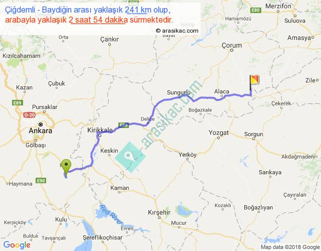 Çiğdemli - Baydiğin arası yaklaşık olarak 90 km/h ile yukarıda belirtilen sürede olup, iki yerin kuş uçuşu uzaklığı (mesafesi) 190'dir. Yolculuk otobüsle 3 saat 46 dakika sürmektedir.