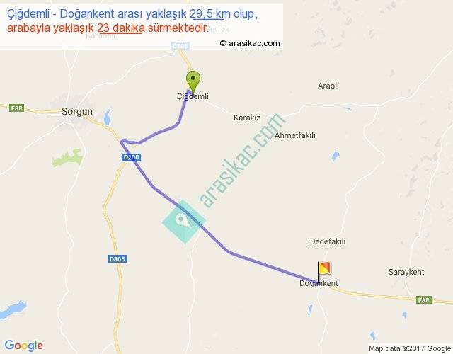 Çiğdemli - Doğankent arası yaklaşık olarak 90 km/h ile yukarıda belirtilen sürede olup, iki yerin kuş uçuşu uzaklığı (mesafesi) 19'dir. Yolculuk otobüsle 29 dakika sürmektedir.