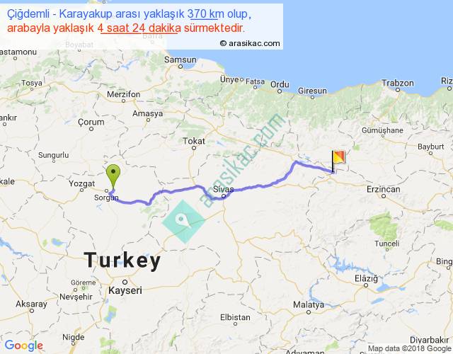 Çiğdemli - Karayakup arası yaklaşık olarak 90 km/h ile yukarıda belirtilen sürede olup, iki yerin kuş uçuşu uzaklığı (mesafesi) 290'dir. Eğer belirtilen yerler arasında uçak seferi var ise bu süre uçakla 26 dakika'ya kadar düşebilir. Yolculuk otobüsle 5 saat 43 dakika sürmektedir.
