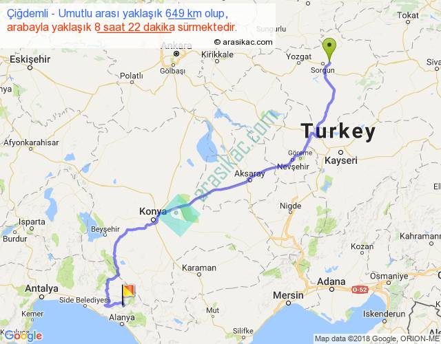 Çiğdemli - Umutlu arası yaklaşık olarak 90 km/h ile yukarıda belirtilen sürede olup, iki yerin kuş uçuşu uzaklığı (mesafesi) 442'dir. Eğer belirtilen yerler arasında uçak seferi var ise bu süre uçakla 40 dakika'ya kadar düşebilir. Yolculuk otobüsle 10 saat 52 dakika sürmektedir.