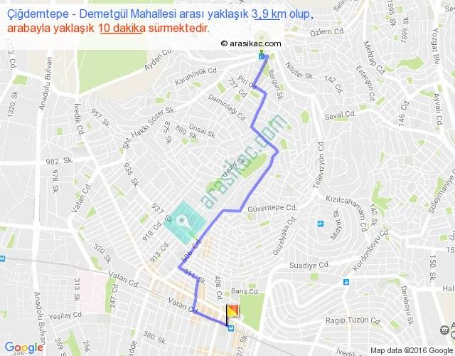 Çiğdemtepe - Demetgül Mahallesi arası yaklaşık olarak 90 km/h ile yukarıda belirtilen sürede olup, iki yerin kuş uçuşu uzaklığı (mesafesi) 3'dir. Yolculuk otobüsle 13 dakika sürmektedir.