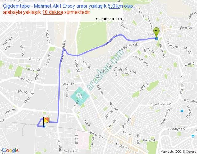 Çiğdemtepe - Mehmet Akif Ersoy arası yaklaşık olarak 90 km/h ile yukarıda belirtilen sürede olup, iki yerin kuş uçuşu uzaklığı (mesafesi) 3'dir. Yolculuk otobüsle 13 dakika sürmektedir.