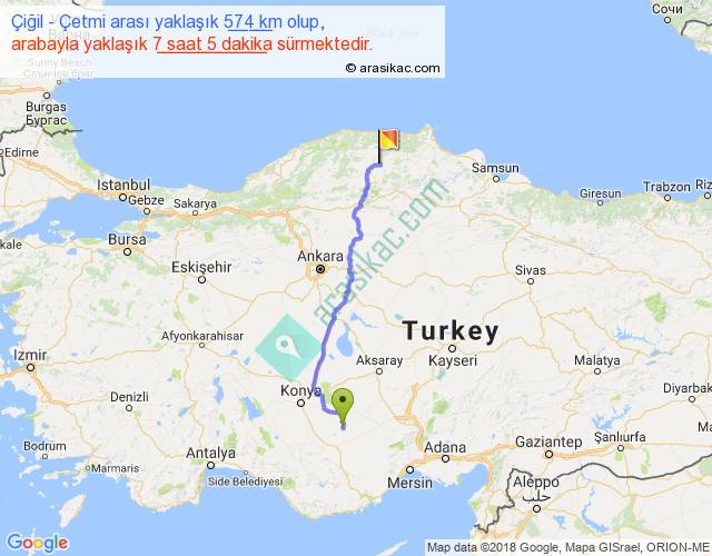 Çiğil - Çetmi arası yaklaşık olarak 90 km/h ile yukarıda belirtilen sürede olup, iki yerin kuş uçuşu uzaklığı (mesafesi) 449'dir. Eğer belirtilen yerler arasında uçak seferi var ise bu süre uçakla 41 dakika'ya kadar düşebilir. Yolculuk otobüsle 9 saat 12 dakika sürmektedir.