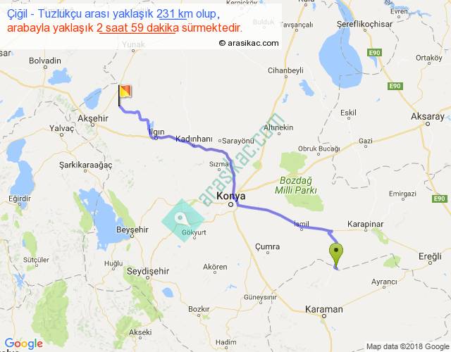 Çiğil - Tuzlukçu arası yaklaşık olarak 90 km/h ile yukarıda belirtilen sürede olup, iki yerin kuş uçuşu uzaklığı (mesafesi) 184'dir. Yolculuk otobüsle 3 saat 52 dakika sürmektedir.