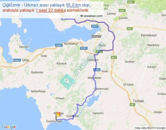 Çiğli İzmir - Ürkmez arası yaklaşık olarak 90 km/h ile yukarıda belirtilen sürede olup, iki yerin kuş uçuşu uzaklığı (mesafesi) 46'dir. Yolculuk otobüsle 1 saat 46 dakika sürmektedir.