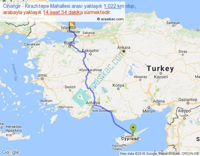 Cihangir - Kirazlıtepe Mahallesi arası yaklaşık olarak 90 km/h ile yukarıda belirtilen sürede olup, iki yerin kuş uçuşu uzaklığı (mesafesi) 750'dir. Eğer belirtilen yerler arasında uçak seferi var ise bu süre uçakla 1 saat 09 dakika'ya kadar düşebilir. Yolculuk otobüsle 18 saat 56 dakika sürmektedir.