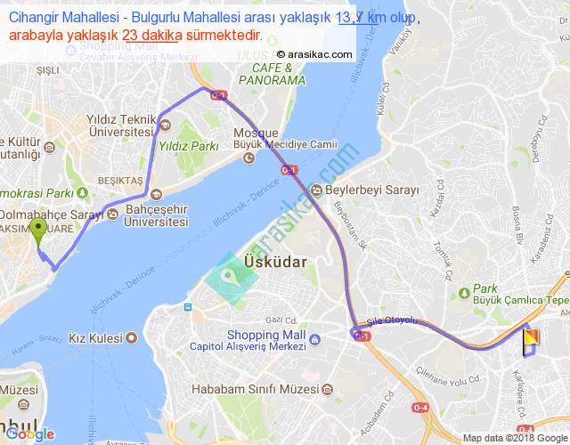 Cihangir Mahallesi - Bulgurlu Mahallesi arası yaklaşık olarak 90 km/h ile yukarıda belirtilen sürede olup, iki yerin kuş uçuşu uzaklığı (mesafesi) 8'dir. Yolculuk otobüsle 29 dakika sürmektedir.