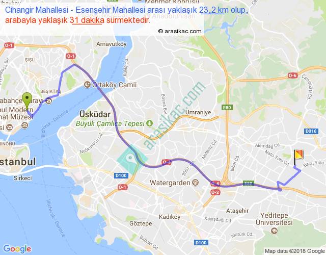 Cihangir Mahallesi - Esenşehir Mahallesi arası yaklaşık olarak 90 km/h ile yukarıda belirtilen sürede olup, iki yerin kuş uçuşu uzaklığı (mesafesi) 15'dir. Yolculuk otobüsle 40 dakika sürmektedir.