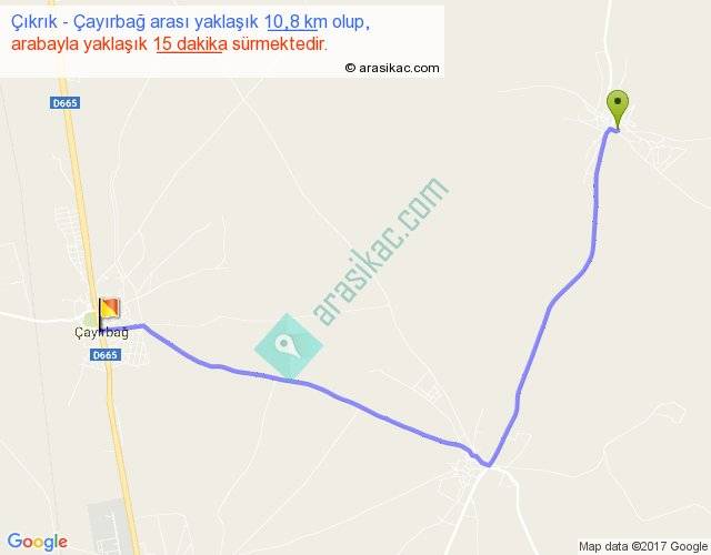 Çıkrık - Çayırbağ arası yaklaşık olarak 90 km/h ile yukarıda belirtilen sürede olup, iki yerin kuş uçuşu uzaklığı (mesafesi) 7'dir. Yolculuk otobüsle 19 dakika sürmektedir.