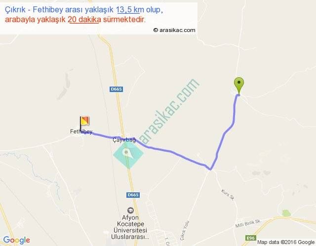 Çıkrık - Fethibey arası yaklaşık olarak 90 km/h ile yukarıda belirtilen sürede olup, iki yerin kuş uçuşu uzaklığı (mesafesi) 10'dir. Yolculuk otobüsle 26 dakika sürmektedir.