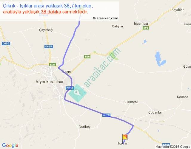 Çıkrık - Işıklar arası yaklaşık olarak 90 km/h ile yukarıda belirtilen sürede olup, iki yerin kuş uçuşu uzaklığı (mesafesi) 27'dir. Yolculuk otobüsle 49 dakika sürmektedir.