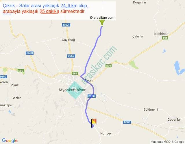 Çıkrık - Salar arası yaklaşık olarak 90 km/h ile yukarıda belirtilen sürede olup, iki yerin kuş uçuşu uzaklığı (mesafesi) 21'dir. Yolculuk otobüsle 32 dakika sürmektedir.