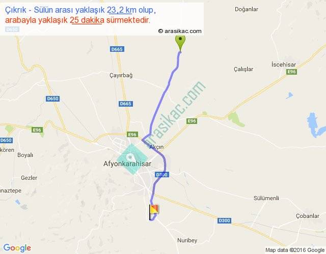 Çıkrık - Sülün arası yaklaşık olarak 90 km/h ile yukarıda belirtilen sürede olup, iki yerin kuş uçuşu uzaklığı (mesafesi) 20'dir. Yolculuk otobüsle 32 dakika sürmektedir.
