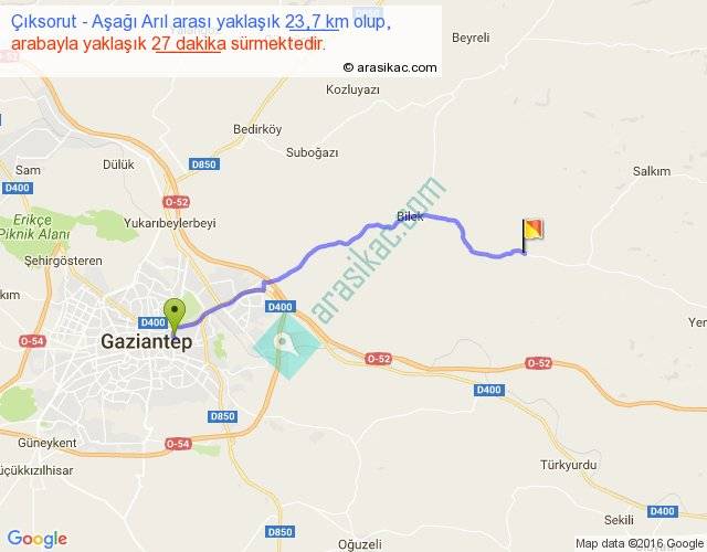 Çıksorut - Aşağı Arıl arası yaklaşık olarak 90 km/h ile yukarıda belirtilen sürede olup, iki yerin kuş uçuşu uzaklığı (mesafesi) 20'dir. Yolculuk otobüsle 35 dakika sürmektedir.