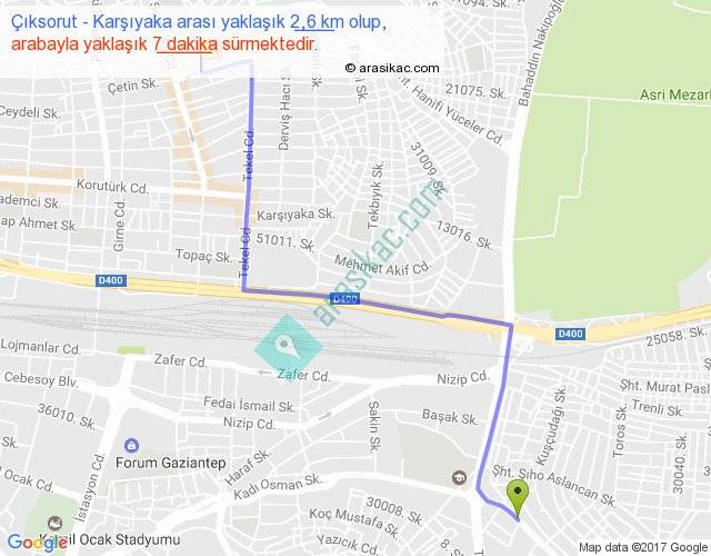 Çıksorut - Karşıyaka arası yaklaşık olarak 90 km/h ile yukarıda belirtilen sürede olup, iki yerin kuş uçuşu uzaklığı (mesafesi) 2'dir. Yolculuk otobüsle 9 dakika sürmektedir.