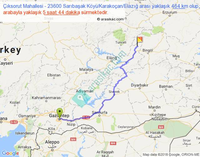 Çıksorut Mahallesi - 23600 Sarıbaşak Köyü Karakoçan Elazığ arası yaklaşık olarak 90 km/h ile yukarıda belirtilen sürede olup, iki yerin kuş uçuşu uzaklığı (mesafesi) 326'dir. Eğer belirtilen yerler arasında uçak seferi var ise bu süre uçakla 30 dakika'ya kadar düşebilir. Yolculuk otobüsle 7 saat 27 dakika sürmektedir.