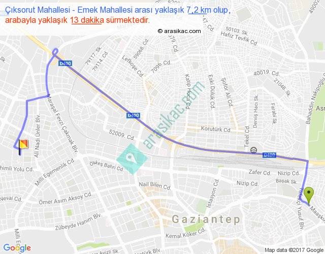 Çıksorut Mahallesi - Emek Mahallesi arası yaklaşık olarak 90 km/h ile yukarıda belirtilen sürede olup, iki yerin kuş uçuşu uzaklığı (mesafesi) 4'dir. Yolculuk otobüsle 16 dakika sürmektedir.