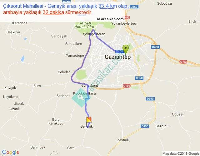 Çıksorut Mahallesi - Geneyik arası yaklaşık olarak 90 km/h ile yukarıda belirtilen sürede olup, iki yerin kuş uçuşu uzaklığı (mesafesi) 16'dir. Yolculuk otobüsle 41 dakika sürmektedir.