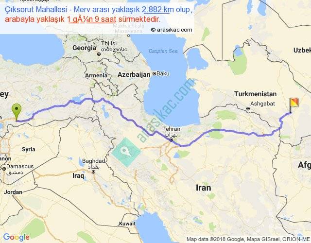 Çıksorut Mahallesi - Merv arası yaklaşık olarak 90 km/h ile yukarıda belirtilen sürede olup, iki yerin kuş uçuşu uzaklığı (mesafesi) 2172'dir. Eğer belirtilen yerler arasında uçak seferi var ise bu süre uçakla 3 saat 20 dakika'ya kadar düşebilir. Yolculuk otobüsle 1 gün 18 saat sürmektedir.