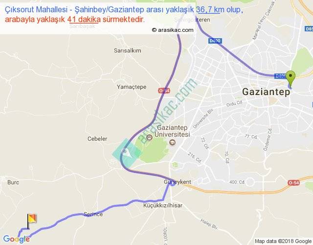 Çıksorut Mahallesi - Şahinbey Gaziantep arası yaklaşık olarak 90 km/h ile yukarıda belirtilen sürede olup, iki yerin kuş uçuşu uzaklığı (mesafesi) 18'dir. Yolculuk otobüsle 53 dakika sürmektedir.