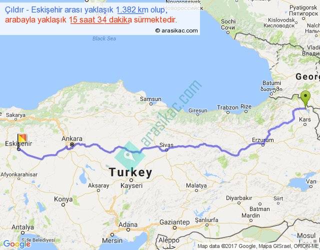 Çıldır - Eskişehir arası yaklaşık olarak 90 km/h ile yukarıda belirtilen sürede olup, iki yerin kuş uçuşu uzaklığı (mesafesi) 1070'dir. Eğer belirtilen yerler arasında uçak seferi var ise bu süre uçakla 1 saat 38 dakika'ya kadar düşebilir. Yolculuk otobüsle 20 saat 14 dakika sürmektedir.