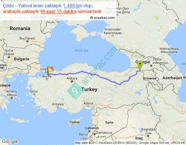 Çıldır - Yalova arası yaklaşık olarak 90 km/h ile yukarıda belirtilen sürede olup, iki yerin kuş uçuşu uzaklığı (mesafesi) 1157'dir. Eğer belirtilen yerler arasında uçak seferi var ise bu süre uçakla 1 saat 46 dakika'ya kadar düşebilir. Yolculuk otobüsle 21 saat 7 dakika sürmektedir.