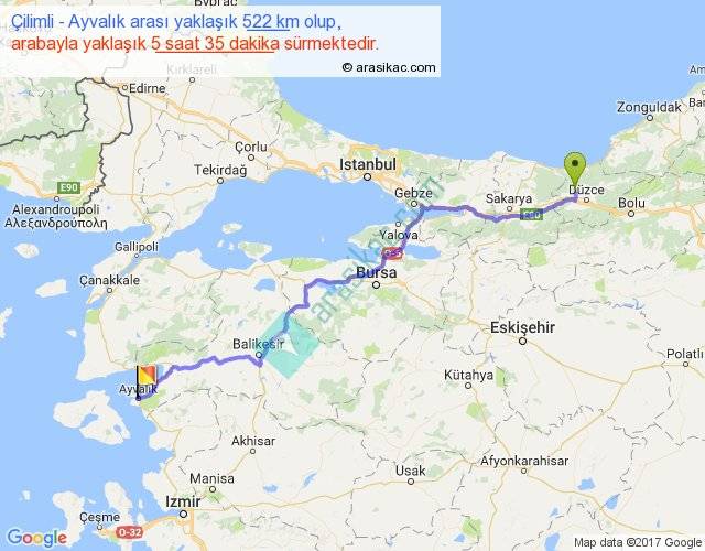 Çilimli - Ayvalık arası yaklaşık olarak 90 km/h ile yukarıda belirtilen sürede olup, iki yerin kuş uçuşu uzaklığı (mesafesi) 407'dir. Eğer belirtilen yerler arasında uçak seferi var ise bu süre uçakla 37 dakika'ya kadar düşebilir. Yolculuk otobüsle 7 saat 15 dakika sürmektedir.
