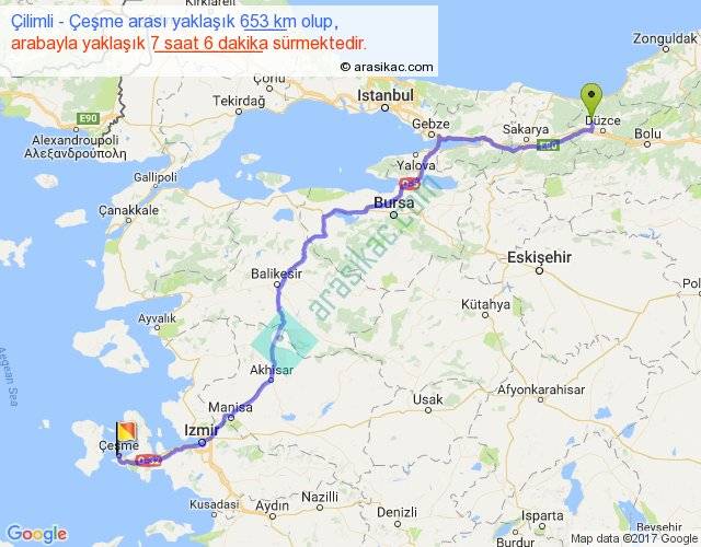 Çilimli - Çeşme arası yaklaşık olarak 90 km/h ile yukarıda belirtilen sürede olup, iki yerin kuş uçuşu uzaklığı (mesafesi) 494'dir. Eğer belirtilen yerler arasında uçak seferi var ise bu süre uçakla 45 dakika'ya kadar düşebilir. Yolculuk otobüsle 9 saat 13 dakika sürmektedir.