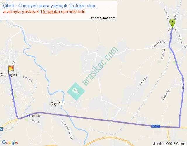 Çilimli - Cumayeri arası yaklaşık olarak 90 km/h ile yukarıda belirtilen sürede olup, iki yerin kuş uçuşu uzaklığı (mesafesi) 8'dir. Yolculuk otobüsle 19 dakika sürmektedir.